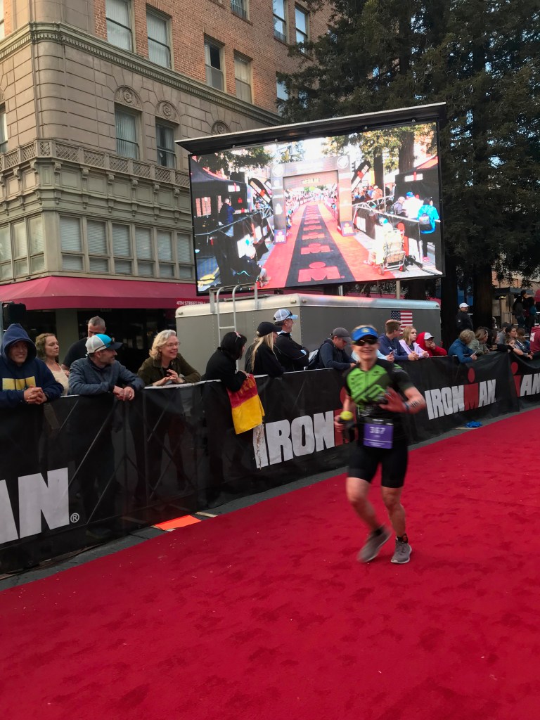 Making that right to the finish line, I could not contain my smile. I was not running faster as I’d hoped, but look at me I made it! I thought about another goal of kicking my heels up at the finish line. A quick assessment of how high I was picking my feet up at this point made it clear that raising my arms was about all I was going to be able to muster. At the same time, hard to believe it was over. Not even sure I wanted it to be over, crazy as that sounds. All through the race I thought, this is my last Ironman and here I was at the finish.