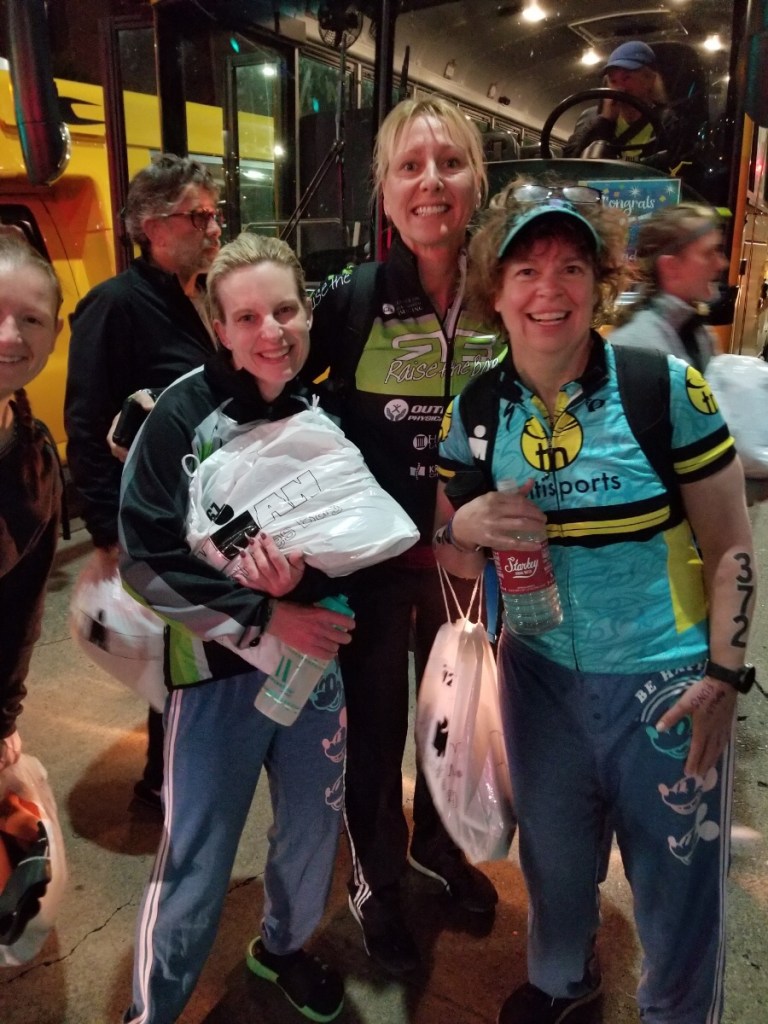 As Ann says, “Happy Ironman Day!” All morning 🙂 – it’s the best. Alarms go off at 3AM – we may not have even slept – to start the eating, bag checking, get out the door by 4AM process. Nerves in the morning, sure. But with a bunch of amazing women and a Dad who is in awe of it all, you can’t help but settle down. Even on the long 35 minute bus ride to the lake in the dark.