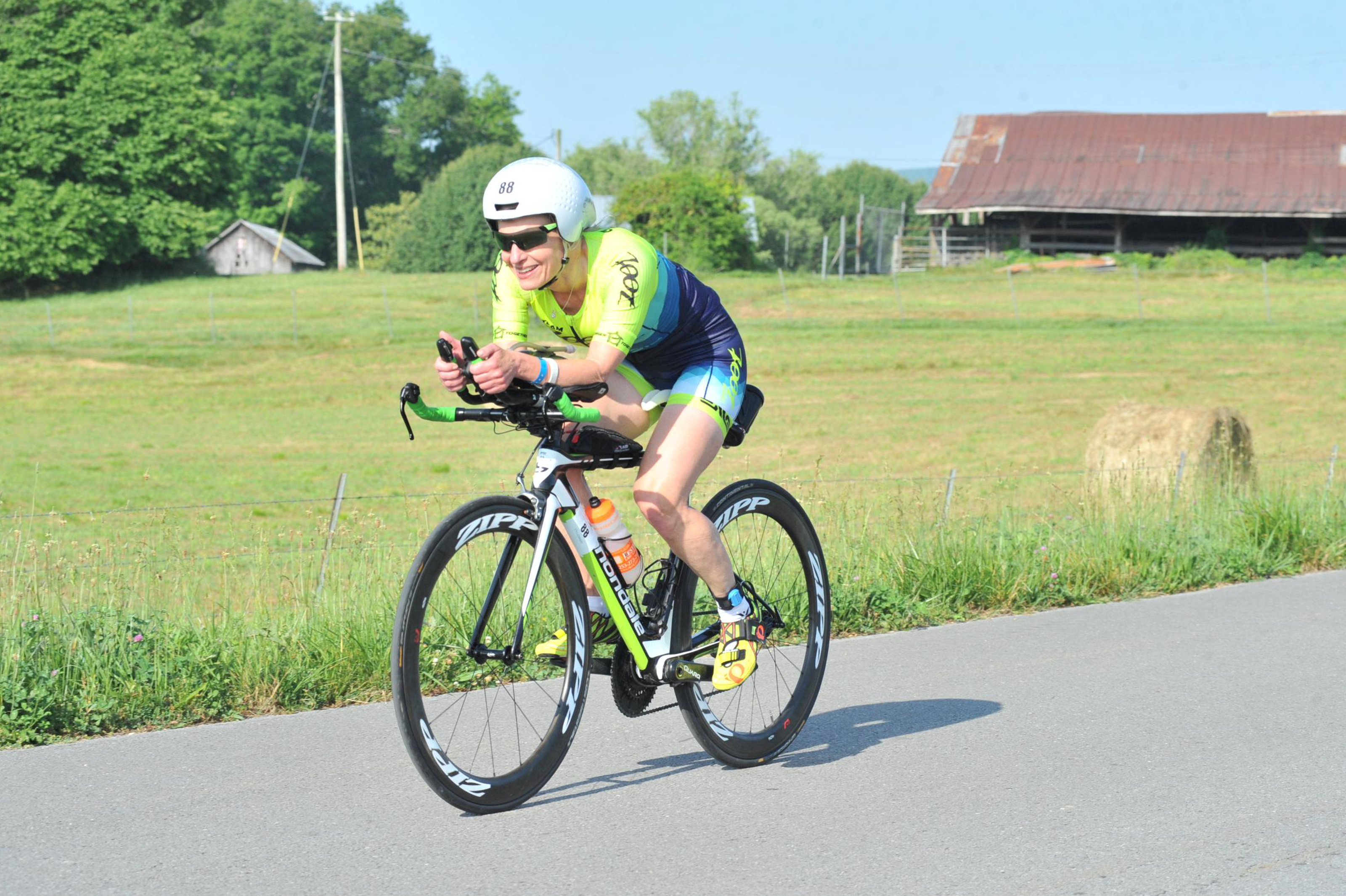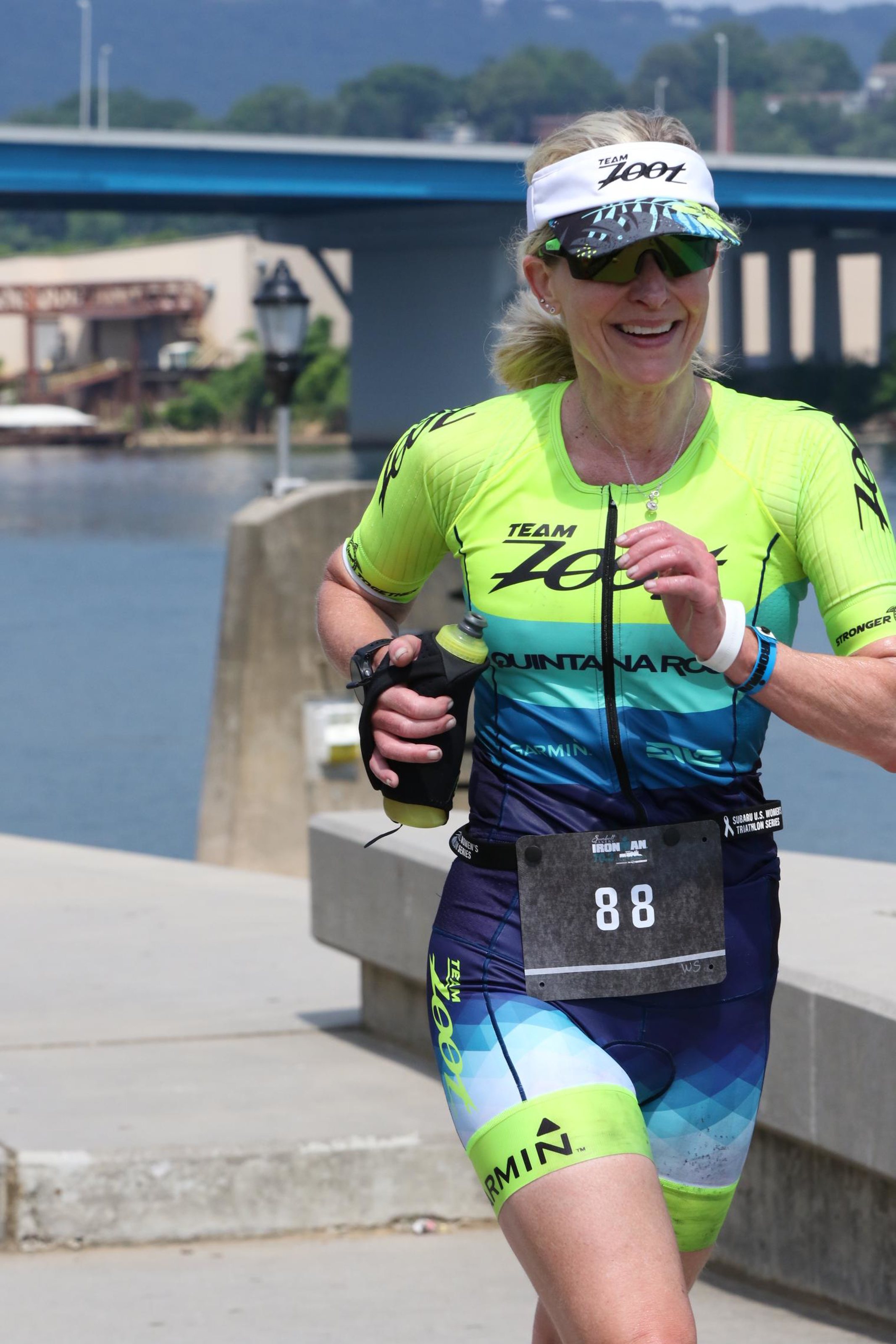 At mile 44, everything changed. Coming up on a small town, I saw a few spectators, a course marshall and a gas station. I was thinking about the big downhill coming up and how fun that would be when I heard a noise. I slowed down and quickly realized something was wrong. I asked the spectators if I had a flat tire, and sure enough the rear was flat. I stopped and tried not to panic. I suck at changing tires. My brain is not mechanical and because I haven’t had to do it hardly at all, out of mind those directions go. Zooters rode by asking if I was okay, saying encouraging words. Sun was out in full force now and I felt taht heat and humidity. Deep breath and I just started with what I knew well, get that back tire off. Got out the tools. Tried to get it off, no dice. Race wheels are so tight. Working it over and over. The tears start and the panic happens as I see the time ticking and feel the sun beating down on me. 15 minutes go by, now I can’t get the new tube in. I am now also furious with myself because I cannot get this done. No excuse for this. I will never forget Michael, the officer on course who came over and asked if I was ok (because I was there for so long). He didn’t know how to change a tire either, but I felt better because he was there. He called for bike tech. He texted Ken because I thought he could talk me through it, but he couldn’t get him. I never stopped trying but when the tech came I thought my day is not over. This will never happen again as I will make it my mission to be an expert at flat tires. I hugged Michael, hopped on and 35 minutes later I was on my way. I focused on being grateful for all the support, and getting back in the race. After a few minutes I realized my power crank wasn’t working. No power average, cadence or targets. I had to go by feel and speed, yet stay in my box, and not panic about the lost time. I reminded myself of my mantra, “I am so blessed I love this”. I made myself smile. I felt better. Finished my nutrition, passed a lot of riders who I’d been ahead of before the flat, and stayed on speed target making it back to transition. Missed my bike goal by exactly the amount of time the flat took. Without it, 2:48, would’ve been 8/97.