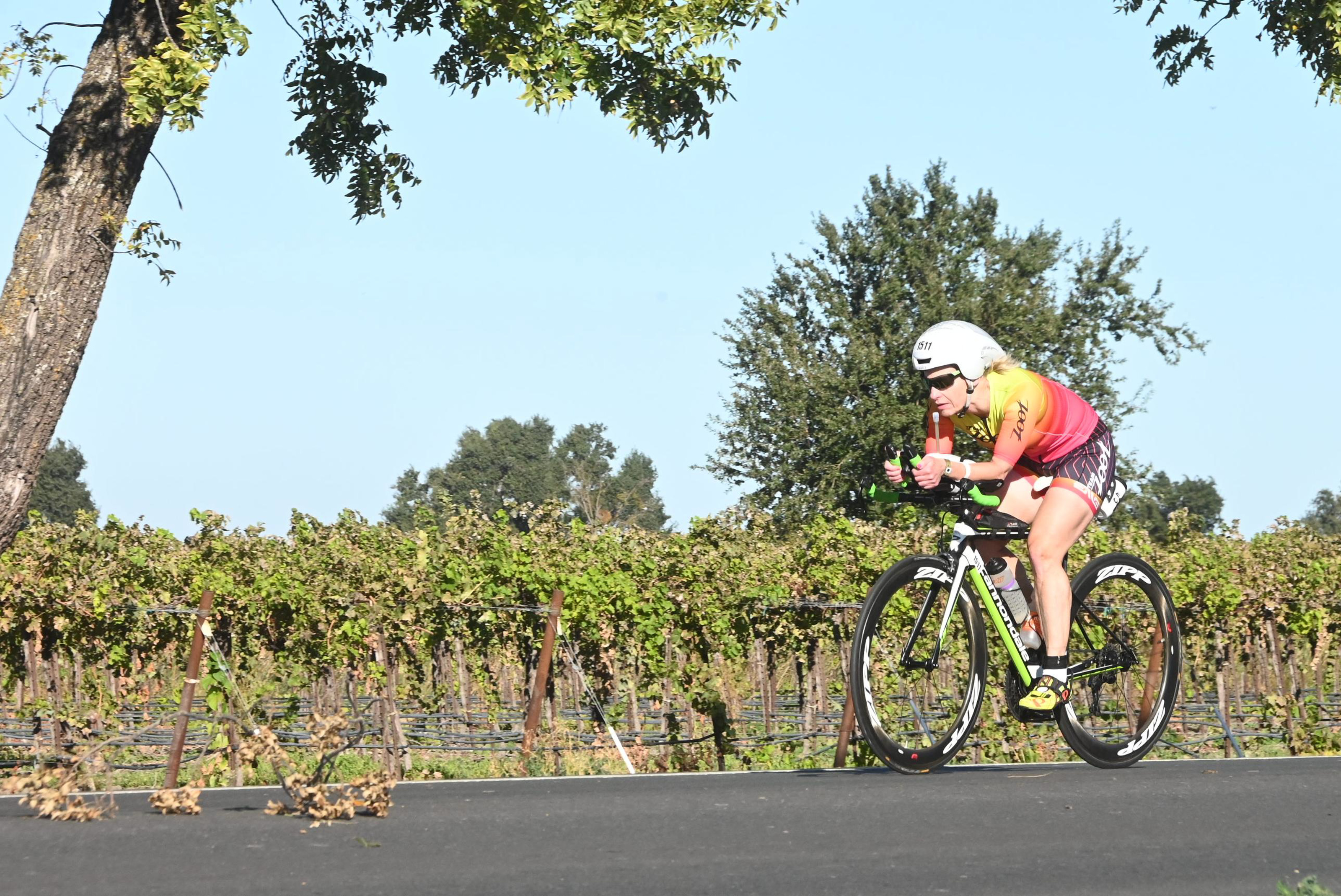 I knew from riding the course previously Babel Slough was a bumpier chip seal section of about 4 miles, 16 miles of the course total. As I turned into that section I thought ok, let’s do this in aero like the last time and just stay relaxed. Even though there were trees here the winds were already making it tough. Turning out down Jefferson at the end of this section, it was clear the winds were going to be the battle of the day. I always use a best Bike Split race plan on my computer, that gives me target power and speed to keep me in my box and make sure I have legs for the run. It didn’t take long for me to realize that my new plan was to just watch my normalized power and IF (Intensity Factor) and ride more conservatively than the plan to keep it real in the crazy winds, which were now becoming stressful. The cross winds really swayed me from side to side, I was getting way too close to the pavement. I had a hard time deciding if aero was better or if I should grab the bars and stay low – which is what I ended up doing A LOT. Whatever my position, I had a death grip on those bars. I was really worried as I passed people or they passed me that any one of us was going down sideways and we were going to have a pile up. Alternatively swearing and praying, I kept moving forward. As I do on all race days, I talked to Sassy thanking her for no mechanicals, and keeping me upright and safe.