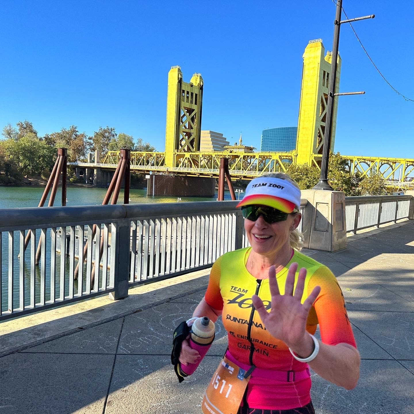 Once we hopped in the line to the river my breathing went back to normal. Mike Reilly was there giving out high fives as we headed down the trail. Seeing him made me happy and I thought ok, this is going to be just fine! I was starting much later than planned but confident I could get in and have a good swim. If this had been a lake or ocean swim, I am not sure I would have been as calm. Since we were so late, they were no longer having 4 people get in every 5 seconds,. As we got to the river they told us to just run down, jump in and start swimming! The water temp was great, and I was happy to finally be out there heading downstream. I swam and definitely enjoyed the river. It was fast, water was clear and I was able to think about form and keep my HR low – winning! Some course markers got moved so at one point I was wide to the left and had a kayaker blow a horn at me and yell at me to go right. It caught me off guard, but I quickly sighted and headed to the right. After that no issues with sighting at all, and I loved hearing my 500 yd intervals go off on my watch so quickly as the current assisted. Without turns around buoys, I had not even one swimmer bump into me. I passed several with my later start, but it was easy to get around and not run into anyone or get ran into – so sweet! I breathe bilaterally, so it was easy for me to spot the bridges and the Delta King steamboat coming up right across from the dock we exited onto to get out of the river. Over so soon, I was ready to get out and get moving on the long run to transition. The people in front of me weren’t in quite as big of a hurry, so I tried to be patient and scoot around. Using what Vince Partridge taught me many years ago, I took off my cap and goggles pulled my arm through and left them in the sleeve as I ran up the long zig zag ramps to one of my favorite parts of an Ironman swim – the wetsuit strippers! Shortly after my friend Sue and her daughter Natalie appeared jogging beside me and yelling at me like crazy. That was the best, I teared up.